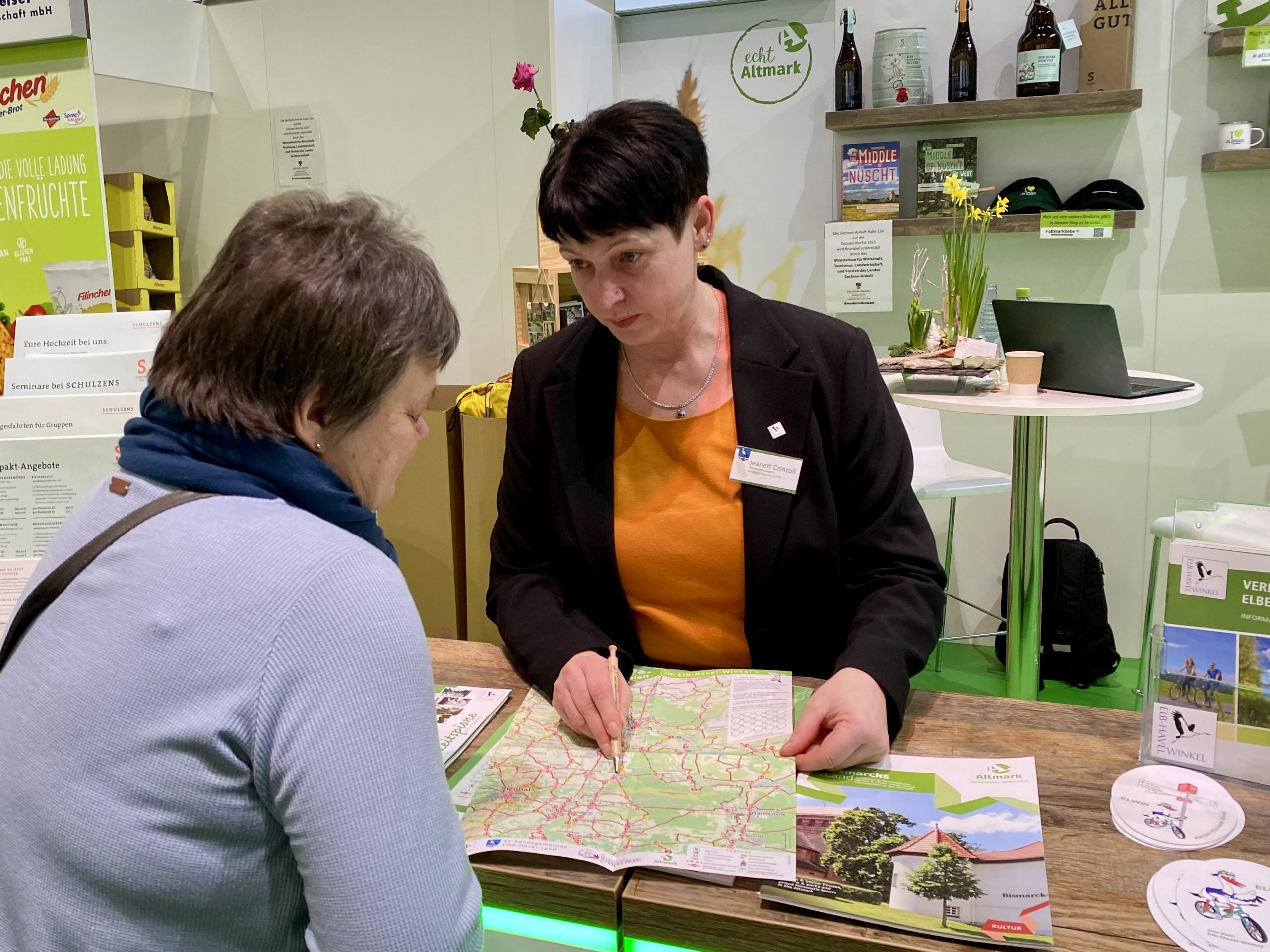 Im Mittelpunkt standen informative Prospekte über den Elb-Havel-Winkel. Besonders groß war das Interesse an den detaillierten Radwanderkarten, die zahlreiche Besucher für sich entdeckten. Hier konnte Frau Czinzoll das innovative Konzept des Radelns nach Zahlen anschaulich in persönlichen Gesprächen erklären und für Begeisterung sorgen.